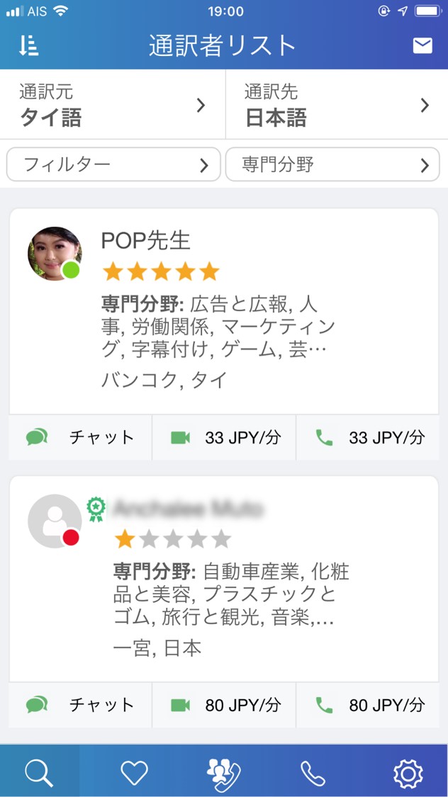 起動後「通訳元=タイ語/通訳先=日本語」で検索して、当校「POP先生」をご指名ください。